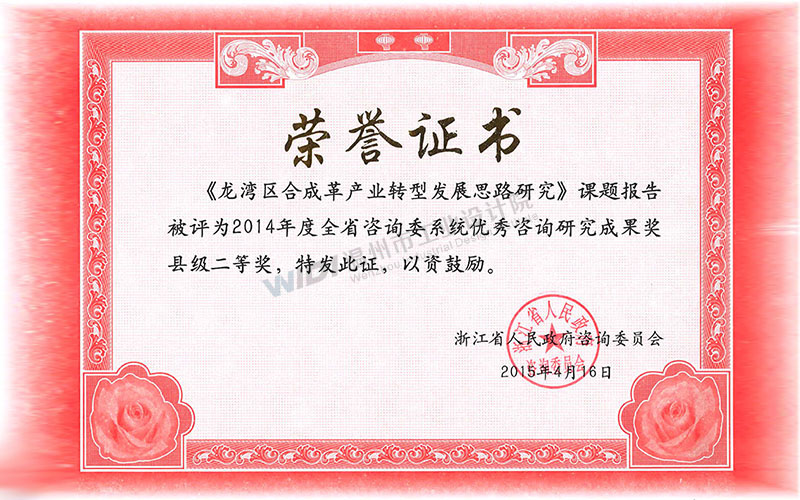 龍灣區(qū)合成革產(chǎn)業(yè)轉(zhuǎn)型發(fā)展思路研究 省咨詢委系統(tǒng)優(yōu)秀咨詢研究成果獎(jiǎng)縣級(jí)二等獎(jiǎng)