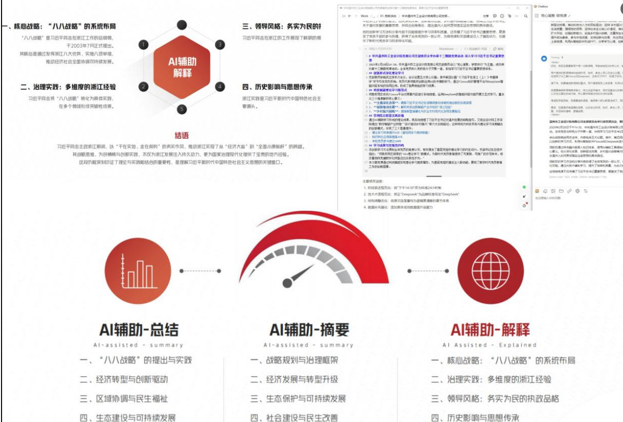 項(xiàng)凱權(quán)同志依托Flowus平臺(tái)對(duì)原著內(nèi)容進(jìn)行系統(tǒng)梳理了習(xí)近平總書(shū)記對(duì)浙江以及溫州發(fā)展的戰(zhàn)略指引,運(yùn)用DeepSeek的智能問(wèn)答功能開(kāi)展交互式學(xué)習(xí),重點(diǎn)從三個(gè)維度解析核心要義:一是全面深化改革,闡釋習(xí)近平總書(shū)記在浙江期間推動(dòng)體制機(jī)制創(chuàng)新的實(shí)踐探索;二是創(chuàng)新驅(qū)動(dòng)發(fā)展,解析科技創(chuàng)新賦能產(chǎn)業(yè)升級(jí)的"浙江經(jīng)驗(yàn)";三是鄉(xiāng)村振興戰(zhàn)略,提煉新型城鎮(zhèn)化與農(nóng)業(yè)農(nóng)村現(xiàn)代化協(xié)同發(fā)展路徑。